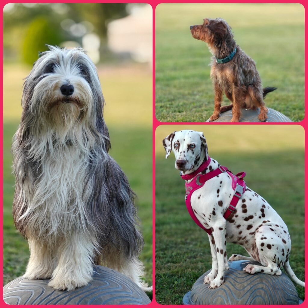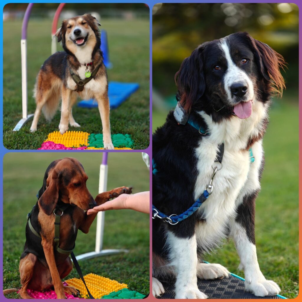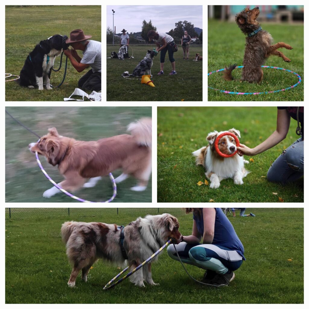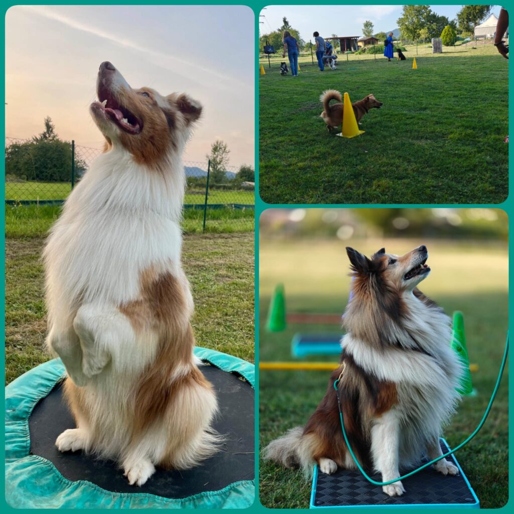Nachdem der Aufbau für ’s Cavaletti gezeigt und geübt wurde, ging es an verschiedene Stationen zur Körperwahrnehmung. Da wir dieses Mal auch eine blinde Hündin dabei hatten, haben wir uns besonders für dieses Team was außerhalb der Cavaletti-Arbeit überlegt.